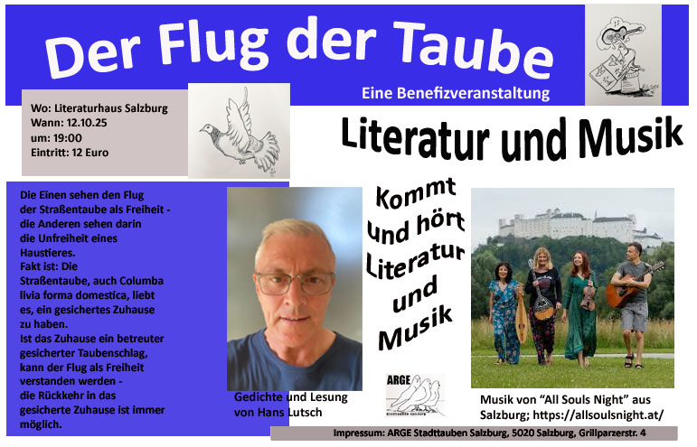Am 12. Oktober 2025 fand im Literaturhaus Salzburg eine Lese- und Musikveranstaltung für die Arbeit vom Verein ARGE Stadttauben Salzburg statt. Die Lesung wurde von der Salzburger Band „All Souls Night“ begleitet. Mehr zu diesem Abend hier.