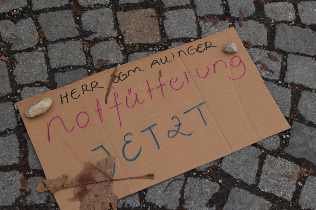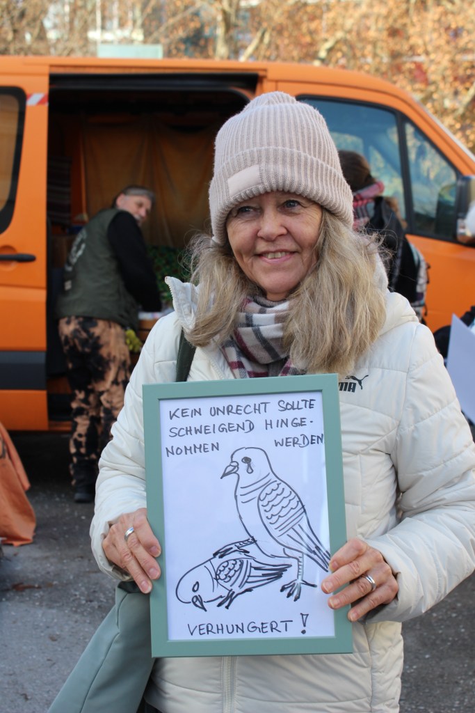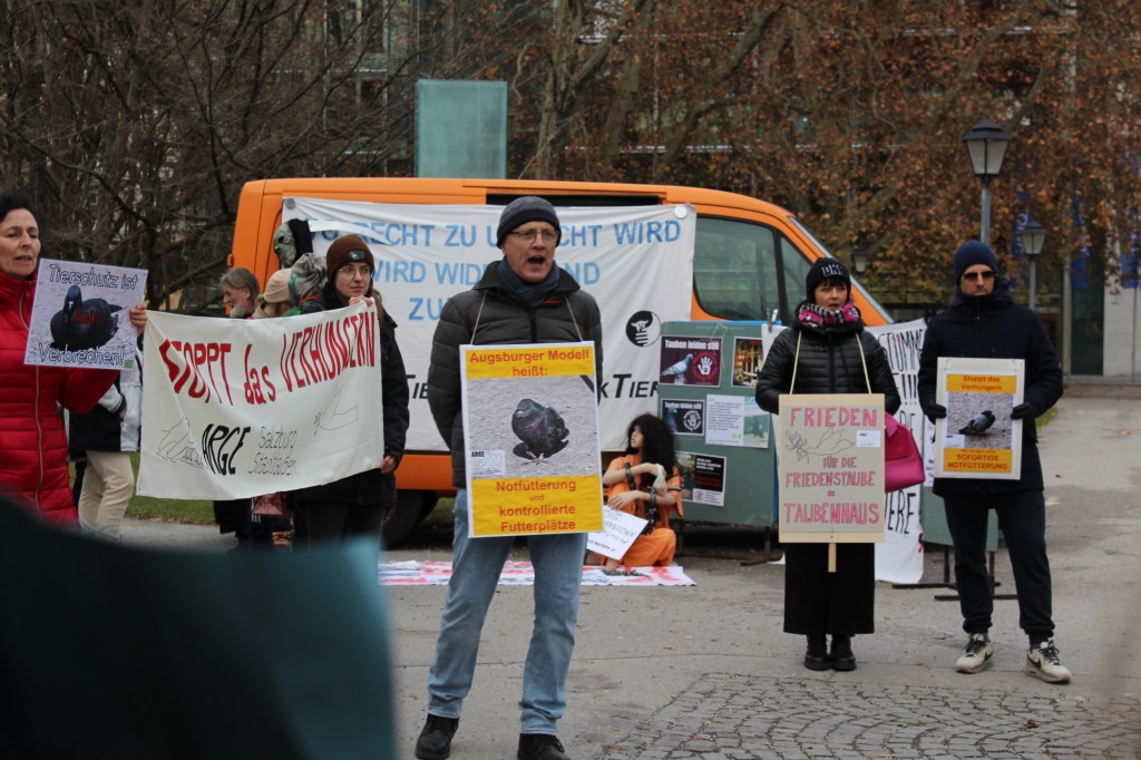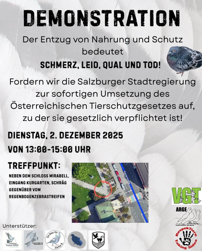 Deshalb demonstrieren wir, die BürgerInnen in Salzburg und FreundInnen, am 02.12.2025 ab 13:00 nahe dem Eingang zum Schloss Mirabell (regenbogenfarbener Zebrastreifen) für die Umsetzung des (versprochenen) „Augsburger Modells“ in seiner Gesamtheit und fordern umgehend die Einhaltung des Österreichischen Tierschutzgesetzes. Wir fordern sofortige „kontrollierte Futterplätze“ für die Salzburger Straßentauben. Dies schützt sie vor dem Hungertod.